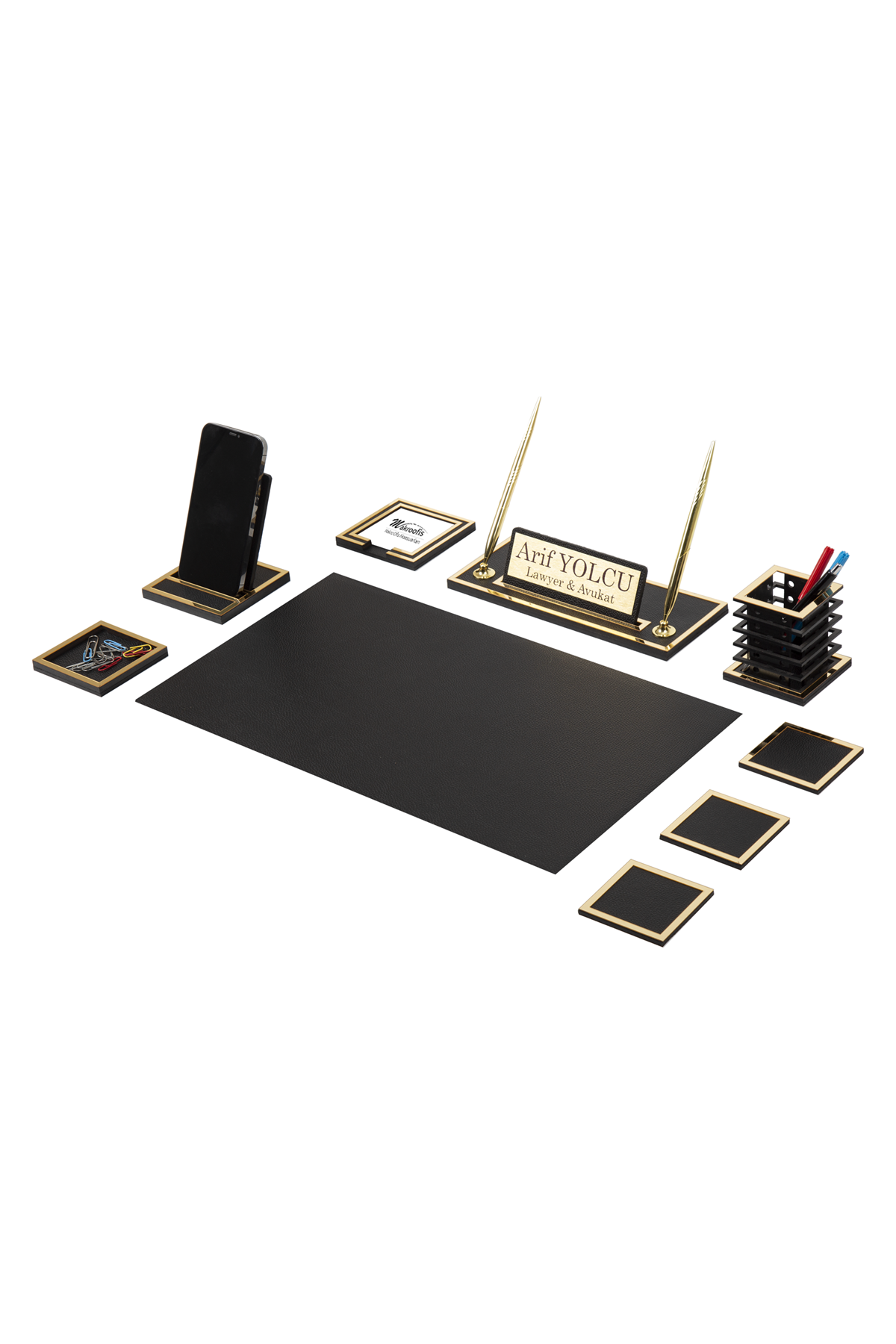 Ürün Bilgisi Modern ve minimalist tasarım, yüksek kaliteli deri malzeme ve tamamen profesyonel el işçiliği ile kişiye özel hazırlanan Asel Gold Sümen Takımı içerisinde ihtiyaç duyabileceğiniz 10 parça ofis aksesuarından oluşmaktadır. İsimlik tabelası, 9 farklı font seçeneği ile üretilebilir ve özelleştirilebilir niteliktedir.Teknik Özellikler