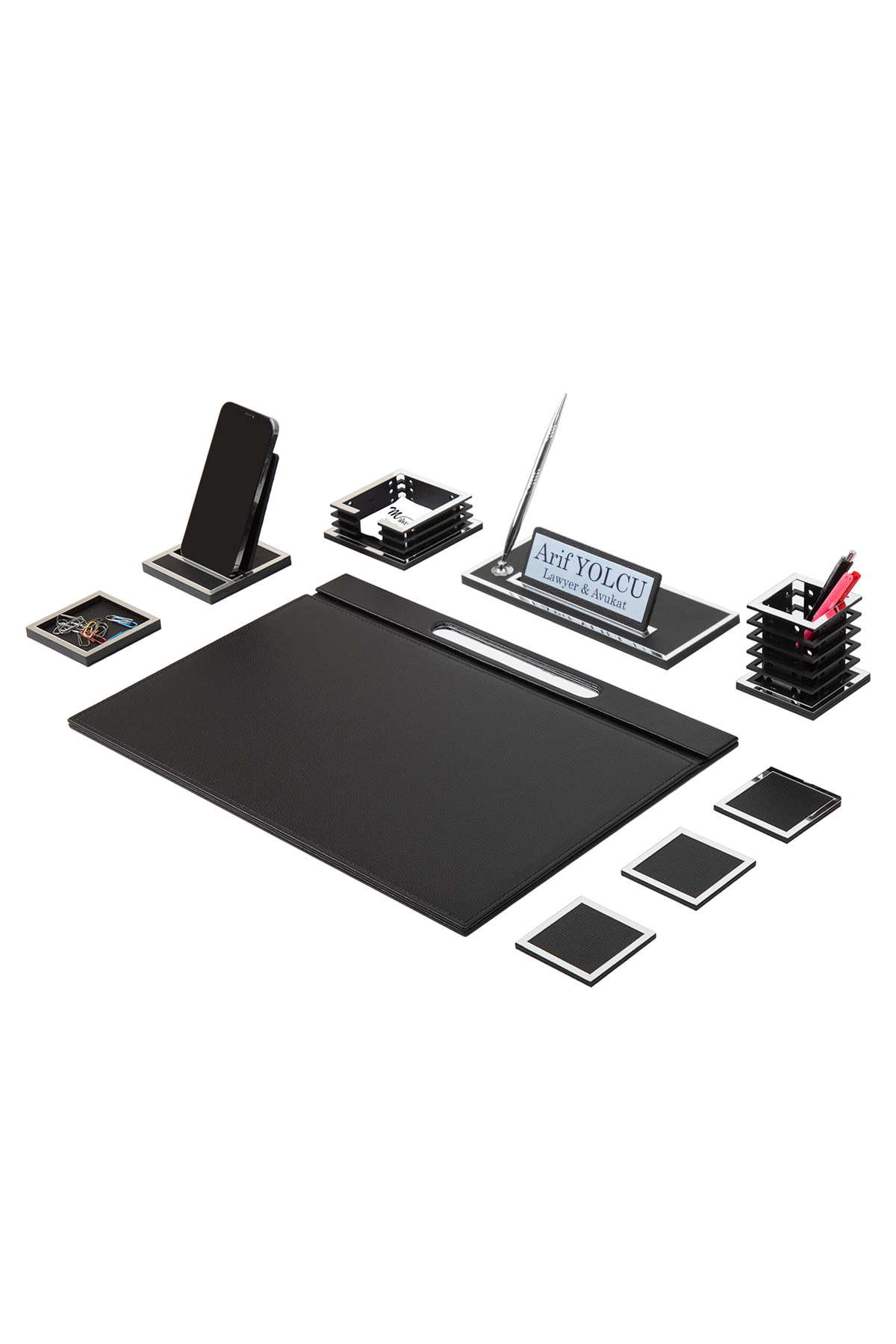 Ürün Bilgisi Modern ve minimalist tasarım, yüksek kaliteli deri malzeme ve tamamen profesyonel el işçiliği ile kişiye özel hazırlanan Diamond Silver Sümen Takımı içerisinde ihtiyaç duyabileceğiniz 10 parça ofis aksesuarından oluşmaktadır. İsimlik tabelası, 9 farklı font seçeneği ile üretilebilir ve özelleştirilebilir niteliktedir.Teknik Özellikler