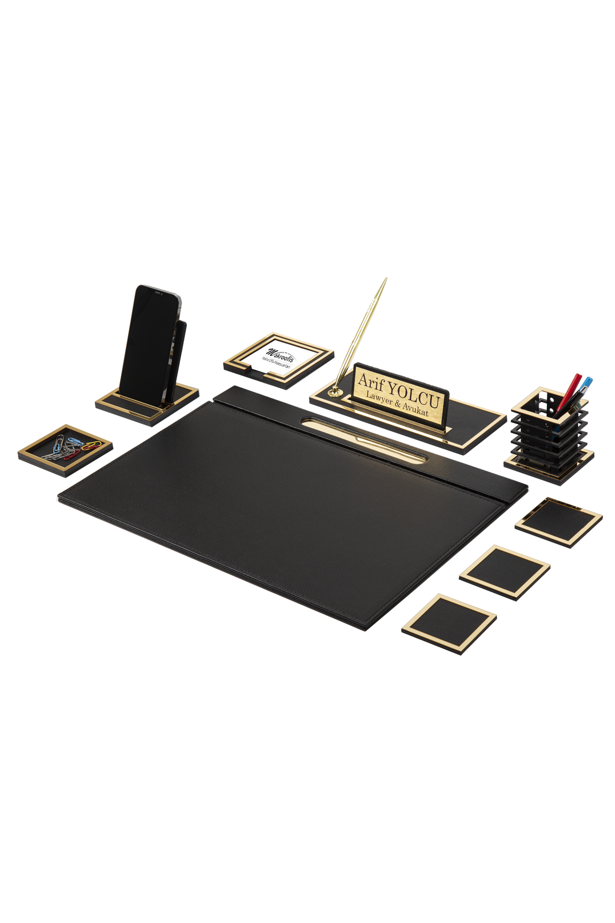 Ürün Bilgisi Modern ve minimalist tasarım, yüksek kaliteli deri malzeme ve tamamen profesyonel el işçiliği ile kişiye özel hazırlanan Lina Gold Sümen Takımı içerisinde ihtiyaç duyabileceğiniz 10 parça ofis aksesuarından oluşmaktadır. İsimlik tabelası, 9 farklı font seçeneği ile üretilebilir ve özelleştirilebilir niteliktedir.Teknik Özellikler