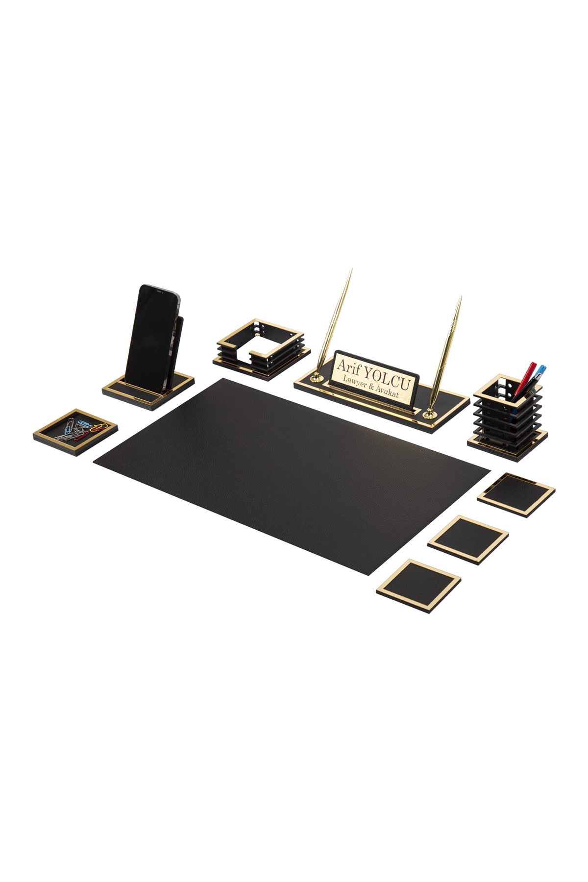 Ürün Bilgisi Modern ve minimalist tasarım, yüksek kaliteli deri malzeme ve tamamen profesyonel el işçiliği ile kişiye özel hazırlanan Nova Gold Sümen Takımı içerisinde ihtiyaç duyabileceğiniz 10 parça ofis aksesuarından oluşmaktadır. İsimlik tabelası, 9 farklı font seçeneği ile üretilebilir ve özelleştirilebilir niteliktedir.Teknik Özellikler