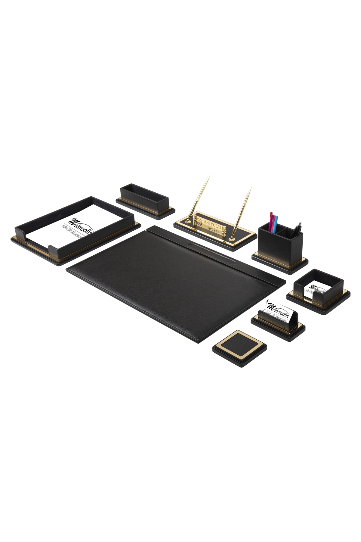 Ofisinizde prestij, düzen ve zarafeti bir araya getirin! Bu lüks siyah sümen takımı, ahşap tabanı ve gold detaylarla zenginleştirilmiş kaliteli suni deri kaplamasıyla dikkat çeker. Modern tasarımı sayesinde hem yöneticiler hem de profesyonel ofis kullanıcıları için mükemmel bir masa düzeni oluşturur.